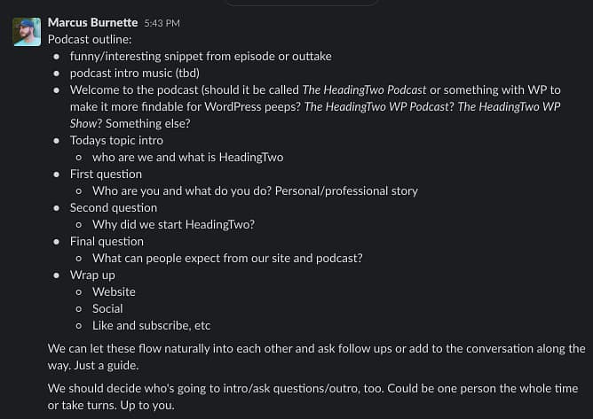 A few hours before getting together to record, we drew up a quick outline in Slack—just to keep the conversation moving along.