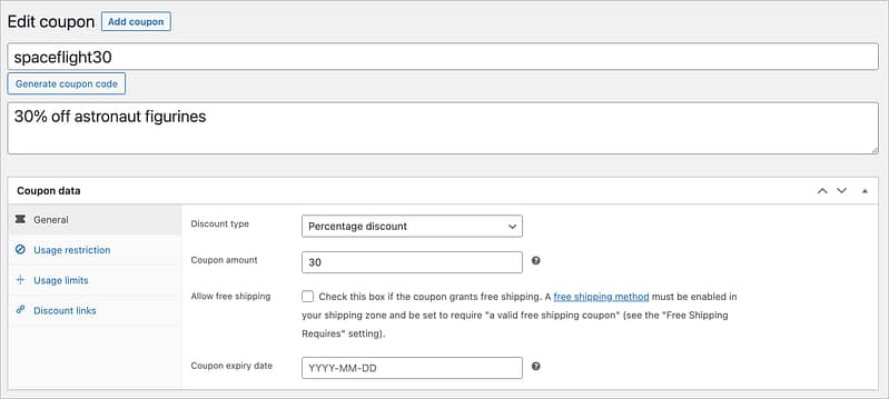 For that, you’ll need to set up a coupon code – something easy to share, but hard-ish to guess. Let’s set one up called spaceflight30. That’s pretty easy to remember but would take quite a while to guess if you didn’t know a promotion was happening at all.